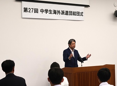 中学生海外派遣団結団式での挨拶の様子